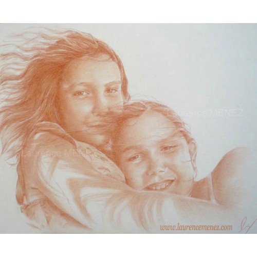 Réalisation d'après photos d'un portrait de 4 visages à la sanguine.