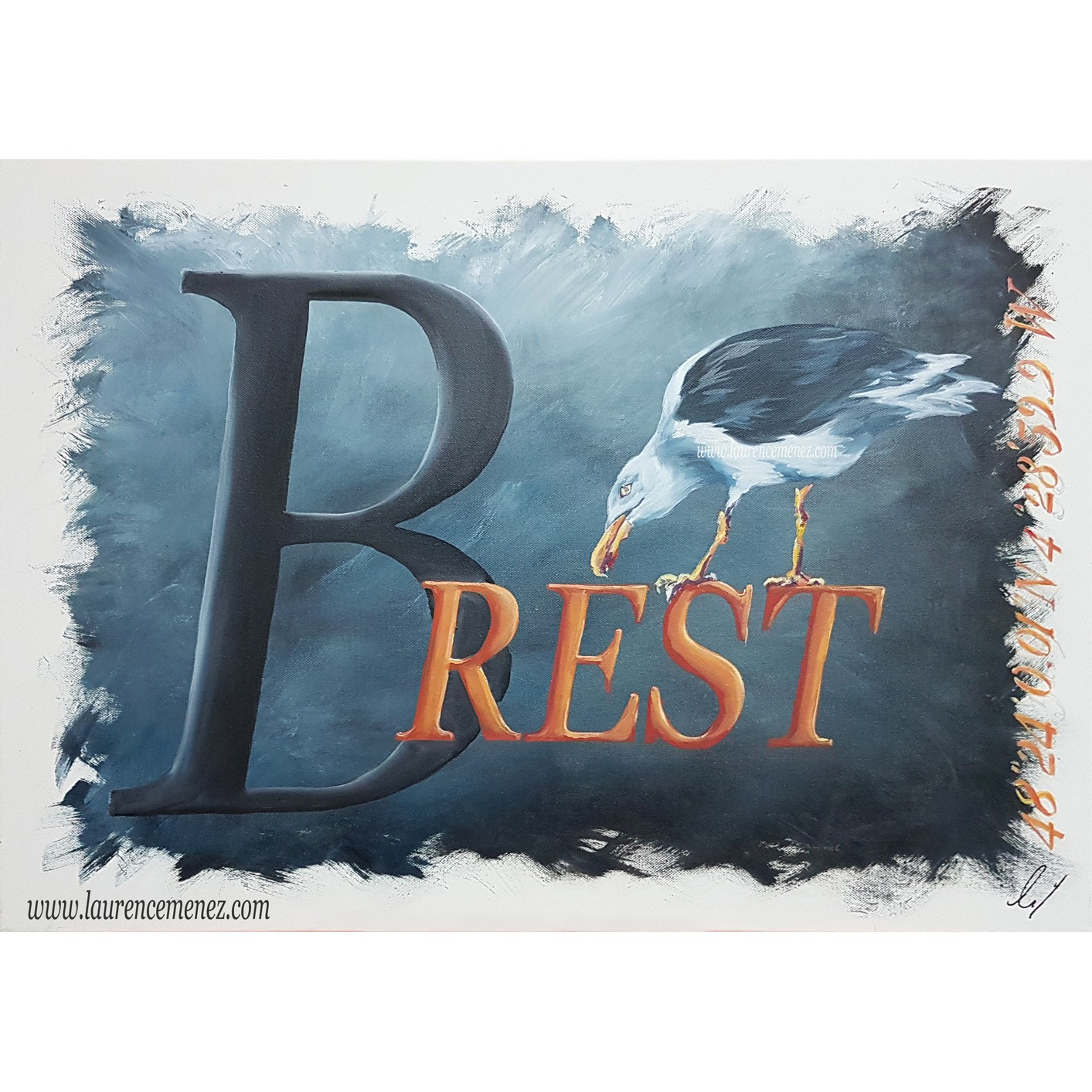 Tableau en peinture à l'huile représentant 1 goéland sur fond gris dégradé avec inscription "BREST" et position gps.