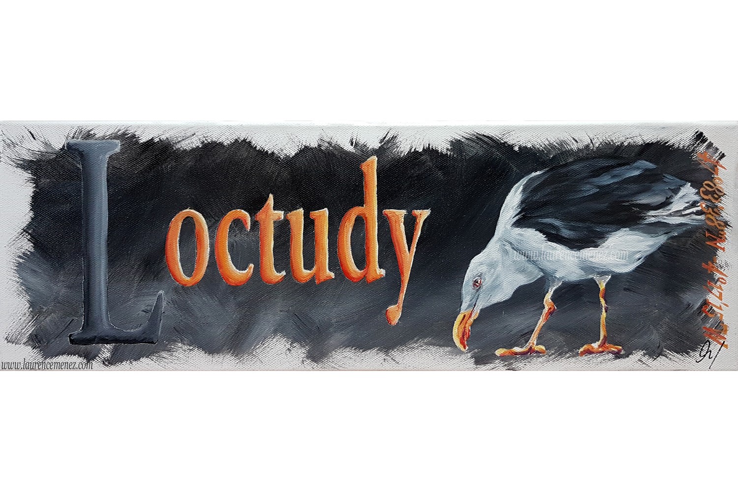 Tableau en peinture à l'huile représentant 1 goéland sur fond gris dégradé avec inscription "LOCTUDY" et position gps.