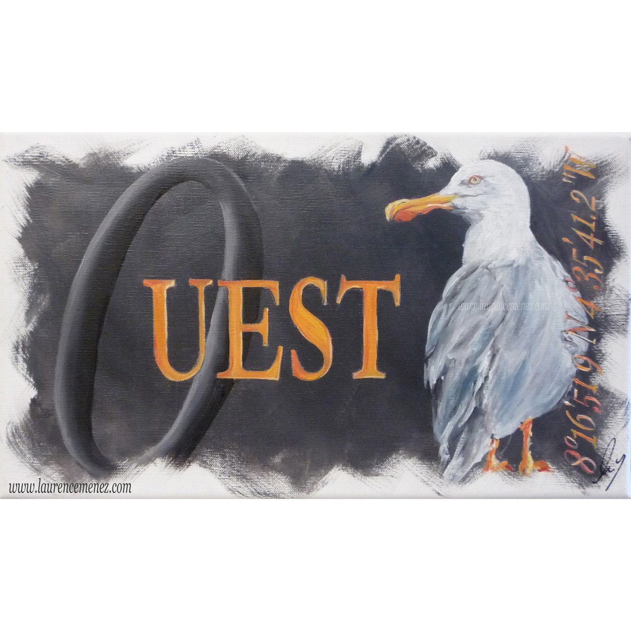 Tableau en peinture à l'huile représentant 1 goéland sur fond gris dégradé avec inscription "OUEST" et position gps.