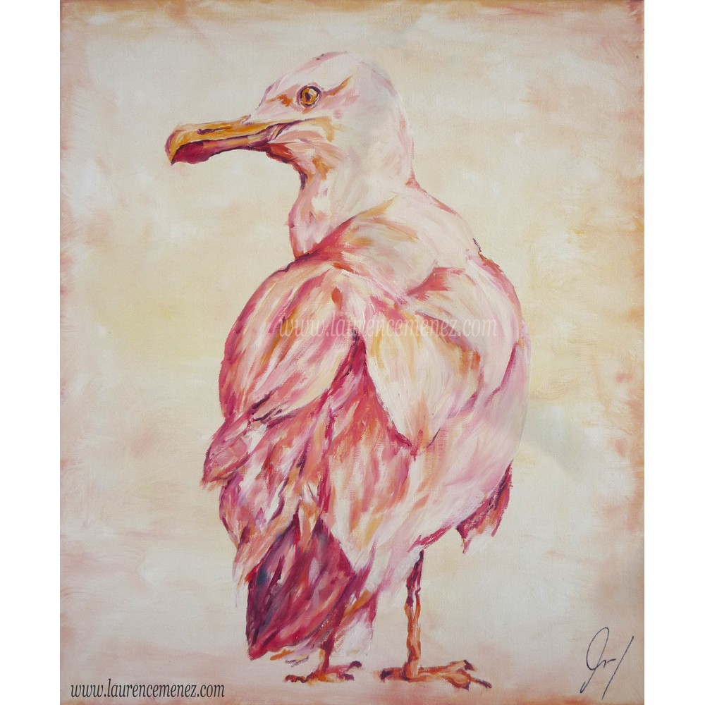 Tableau en peinture à l'huile représentant un goéland de dos dans des tons jaunes rosés.