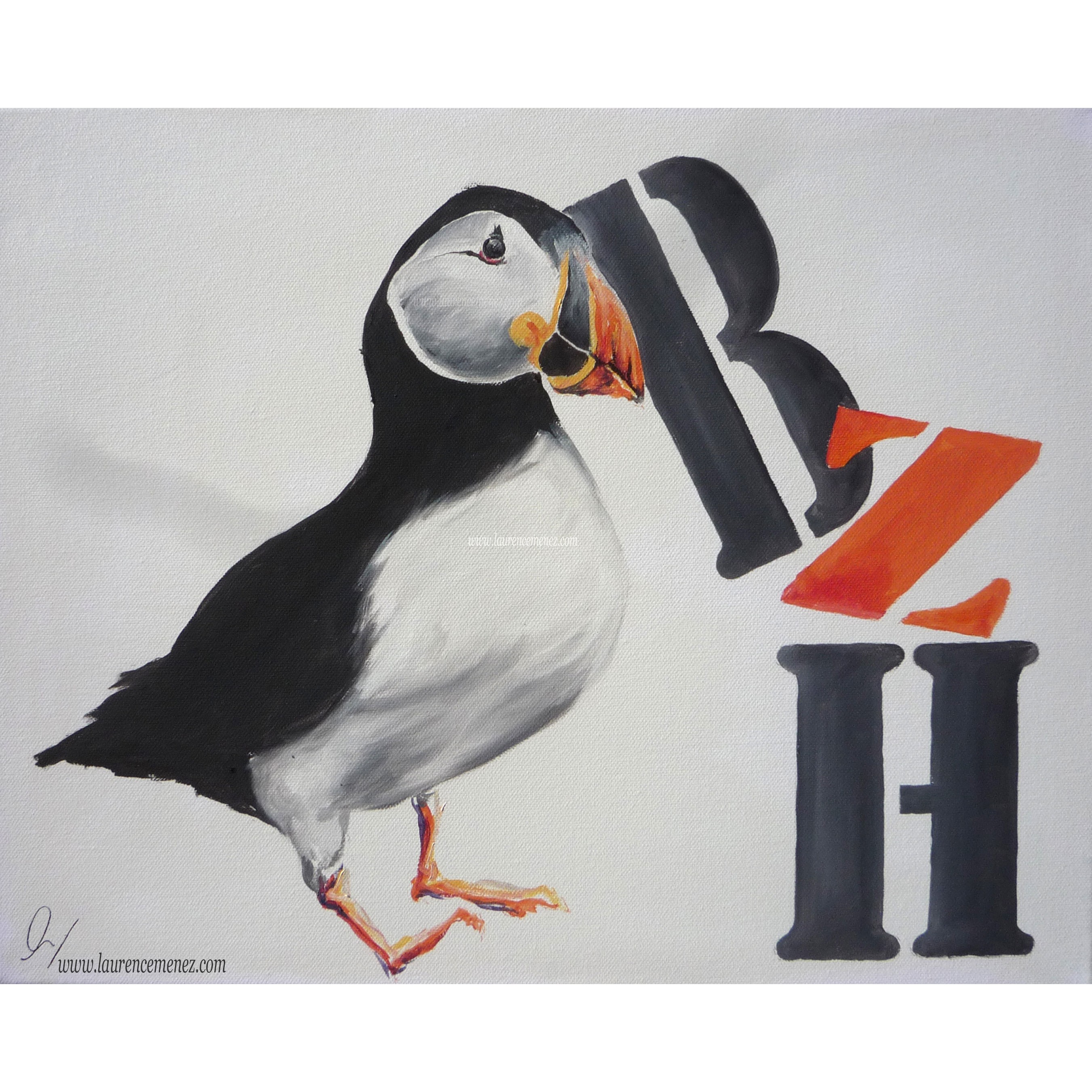 Tableau en peinture à l'huile représentant un macareux sur fond blanc avec inscription "BZH" en gris et orange.