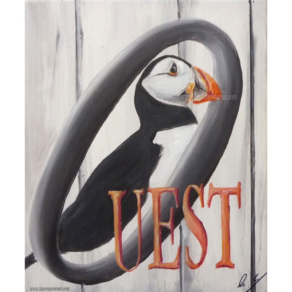 Tableau en peinture à l'huile représentant un macareux sur fond blanc grisé avec inscription "Ouest" en orange.