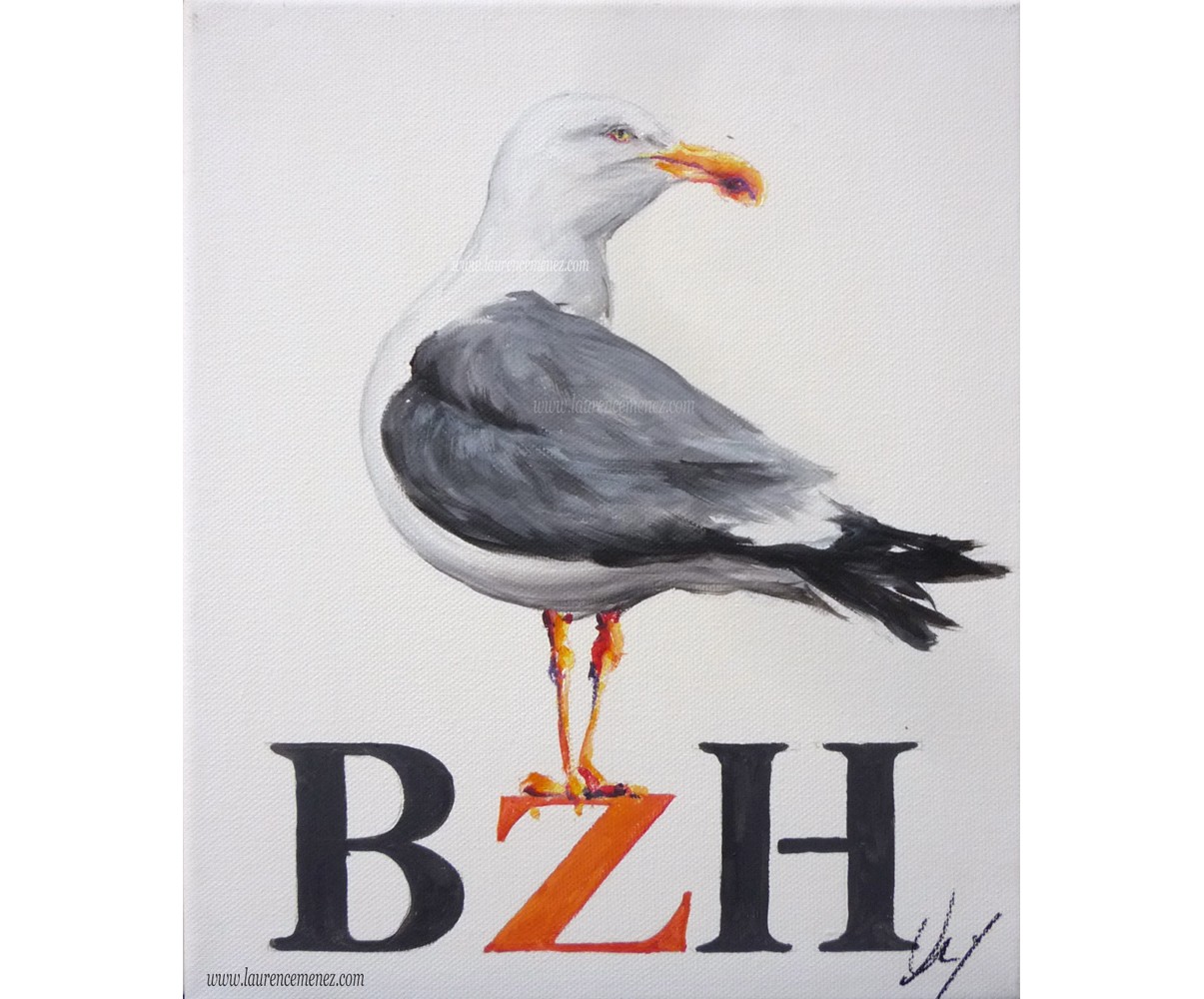 Tableau en peinture à l'huile représentant un goéland sur fond blanc avec inscription "BZH" en gris et orange.