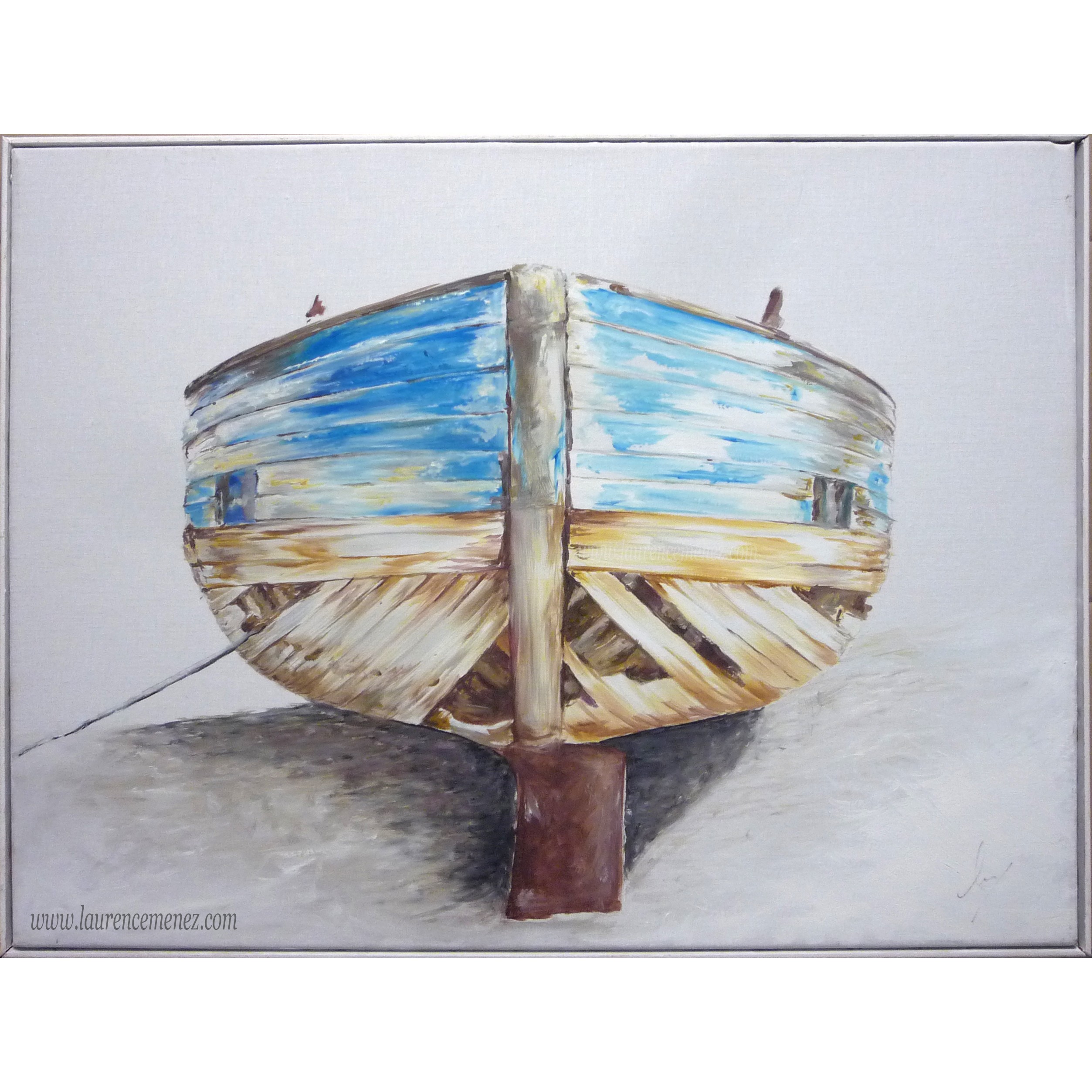 - La toile est tendue sur un châssis bois, ses bords sont encadrés de baguettes blanches et la toile est donc prête à être accrochée au mur.