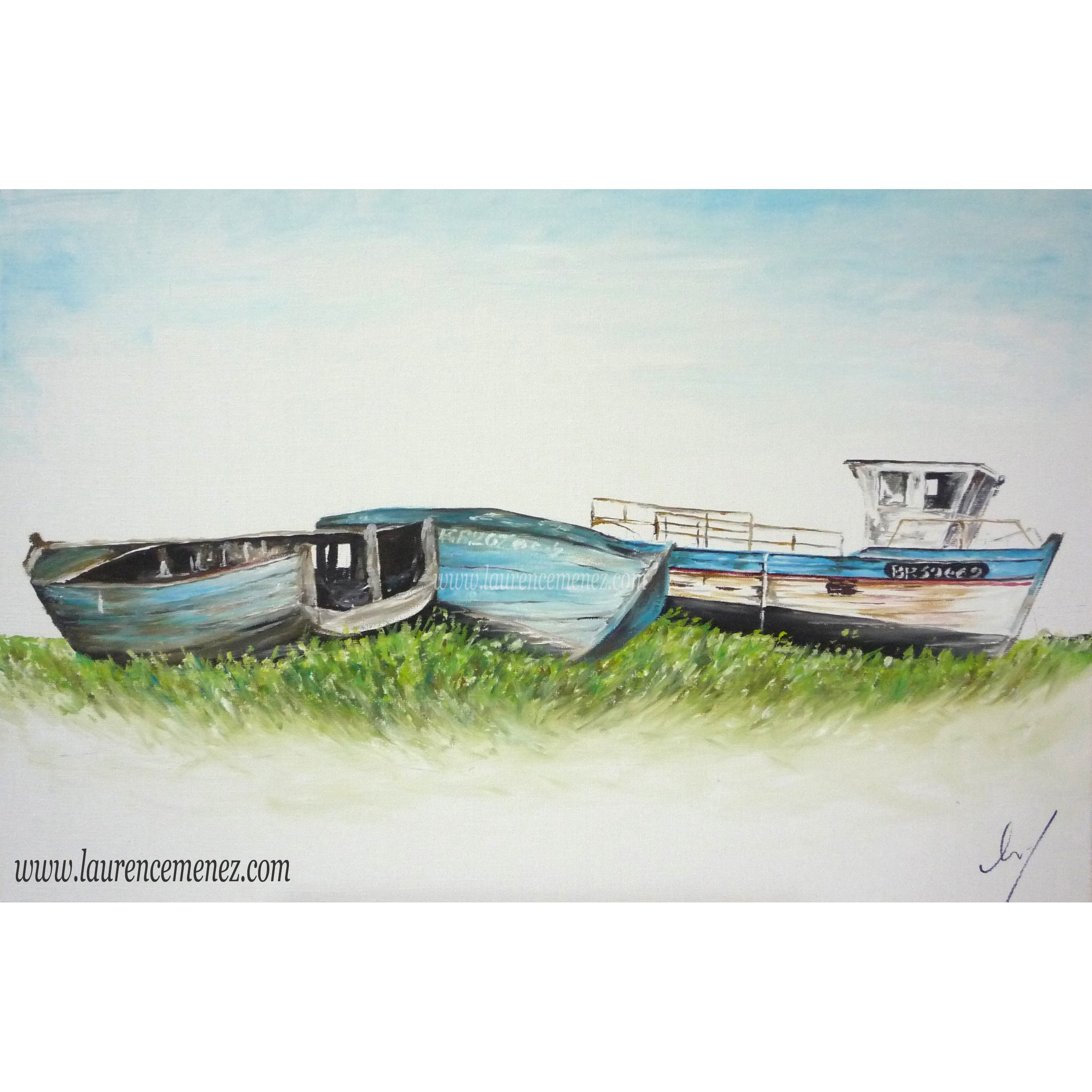 Tableau en peinture à l'huile représentant des bateaux dans le cimetière de bateaux du Fret à Crozon.