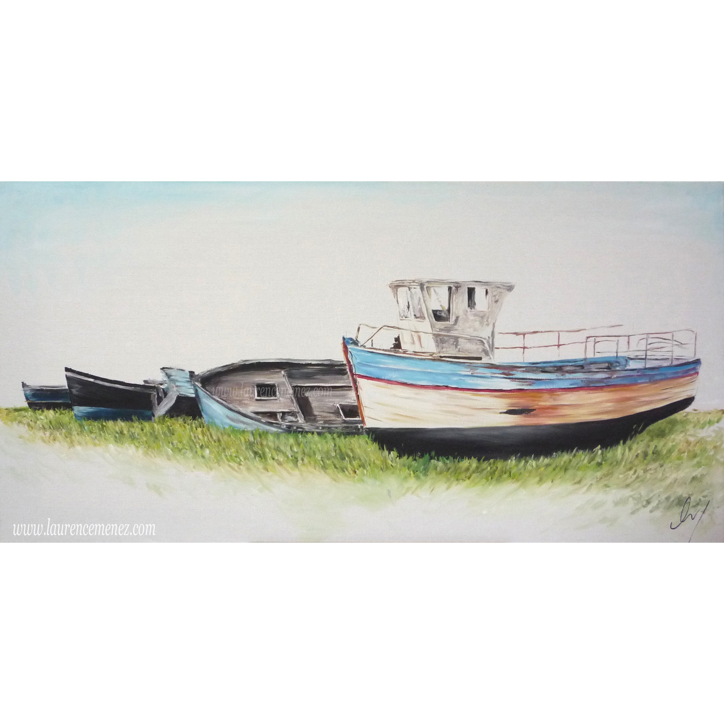 Tableau en peinture à l'huile représentant des bateaux dans le cimetière de bateaux du Fret à Crozon.