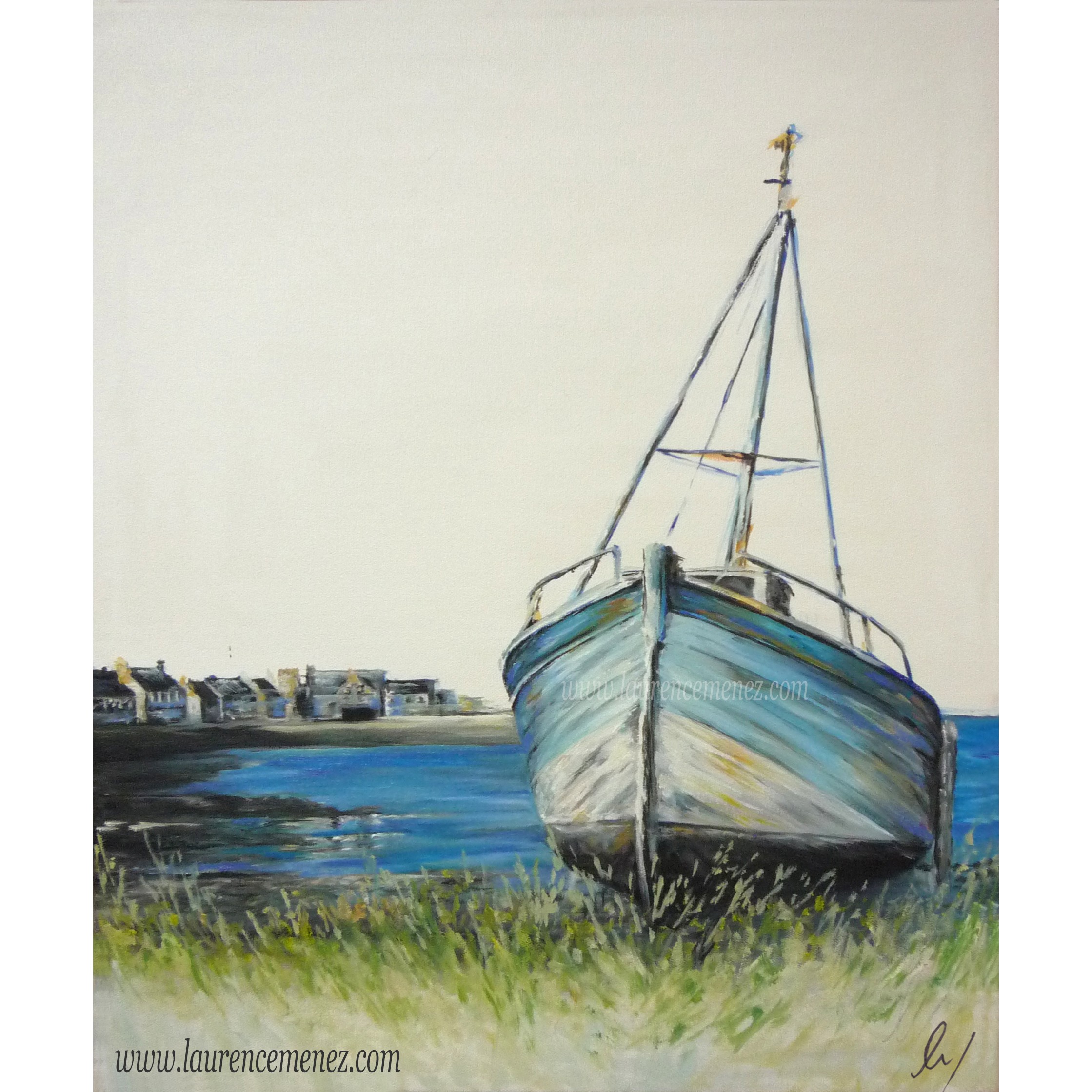 Tableau en peinture à l'huile représentant un bateau dans le cimetière de bateaux du Fret à Crozon.