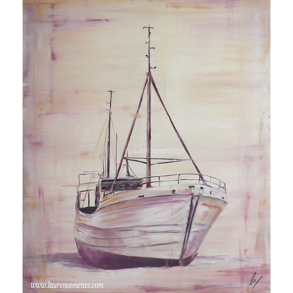 Tableau en peinture à l'huile représentant une épave dans le cimetière de bateaux de Camaret-sur-Mer, teintes parmes.