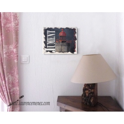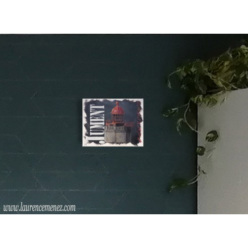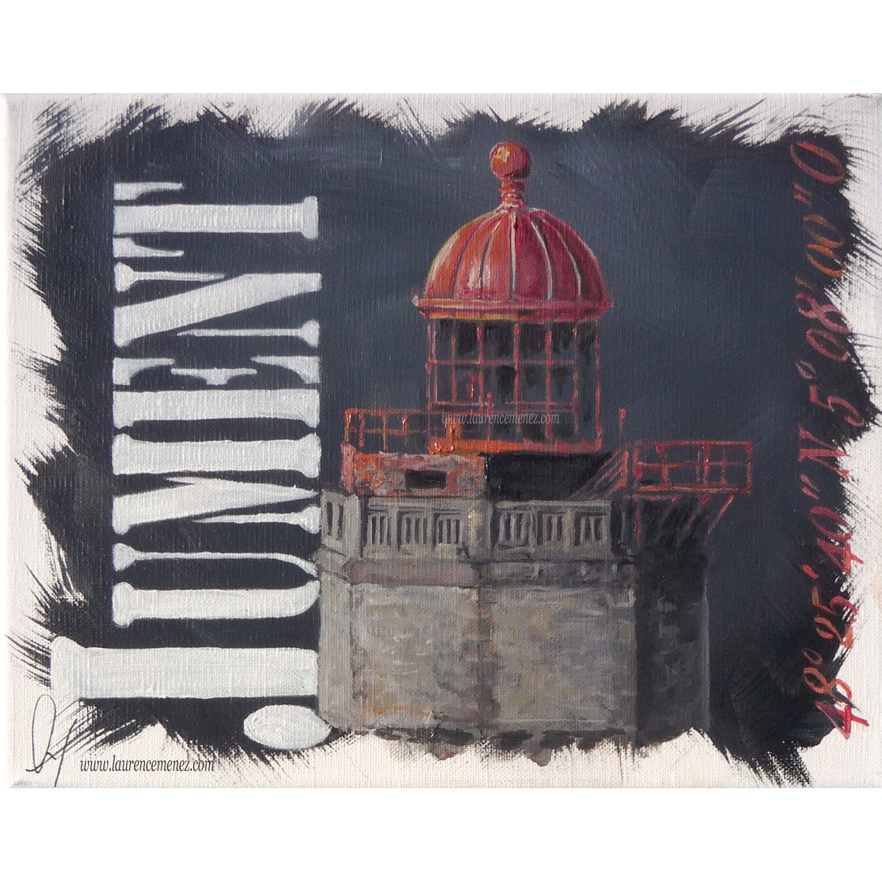 Tableau peinture à l'huile représentant le phare de la Jument sur fond gris dégradé avec texte blanc, et position GPS du phare.