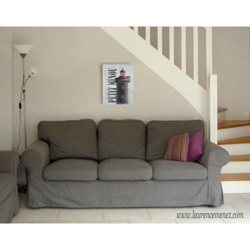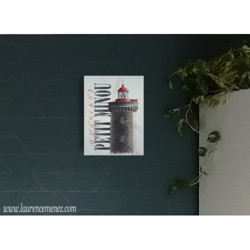 Tableau en peinture à l'huile représentant le phare du Petit Minou sur fond blanc avec texte, et position GPS du phare.