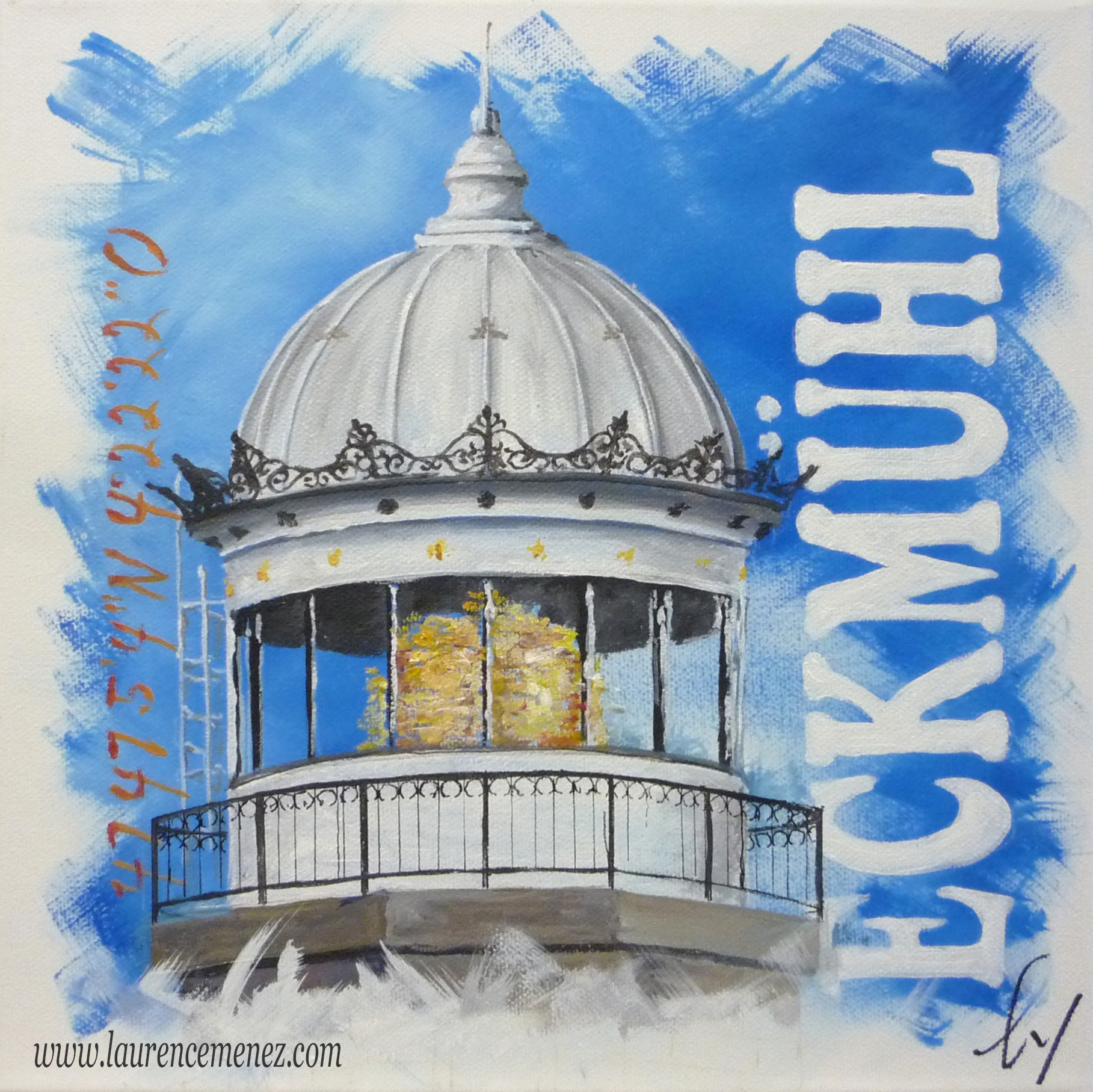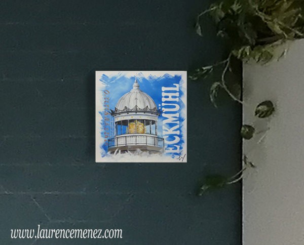 Tableau peinture à l'huile représentant le Phare d'Eckmühl sur fond Bleu dégradé avec texte blanc, et position GPS du phare en orange.