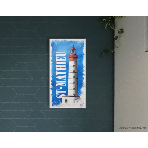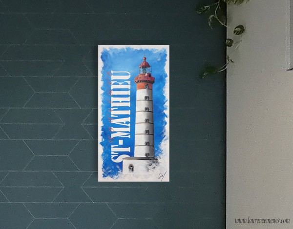 Tableau peinture à l'huile représentant le phare de Saint-Mathieu à Plougonvelin, sur fond bleu dégradé avec texte blanc et orange, et position GPS du phare.