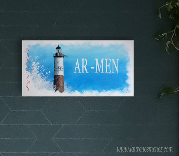 Tableau peinture à l'huile représentant le Phare d'Ar-Men sur fond Bleu dégradé avec texte blanc, et position GPS du phare en orange.