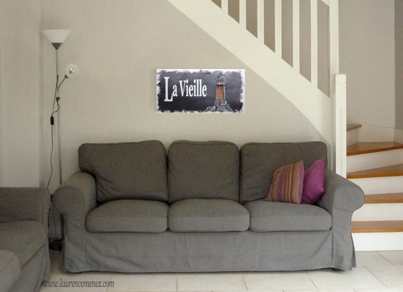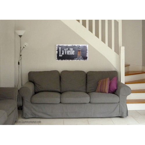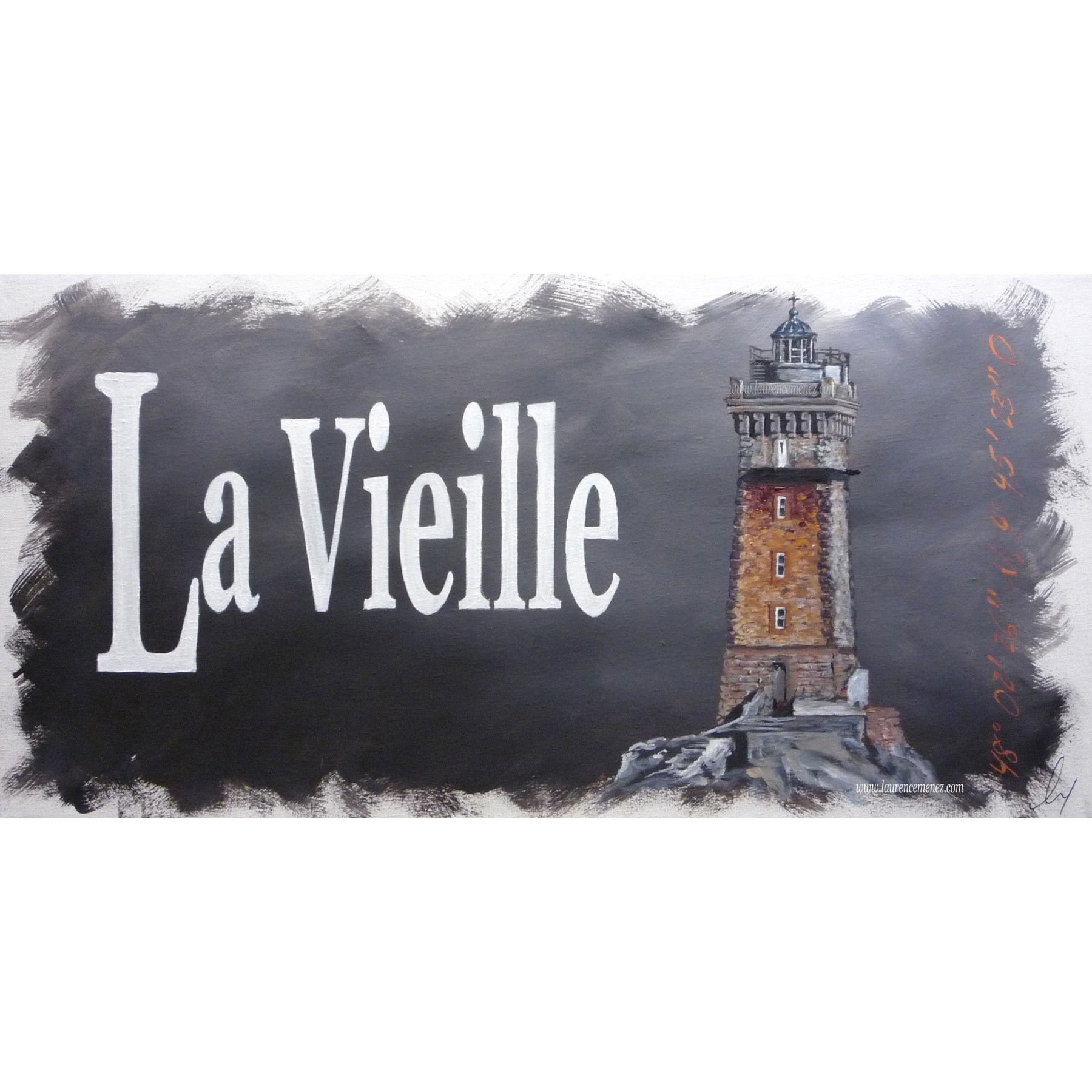 Tableau en peinture à l'huile représentant le phare de la Vieille sur fond gris dégradé avec texte blanc et noir, et position GPS du phare.