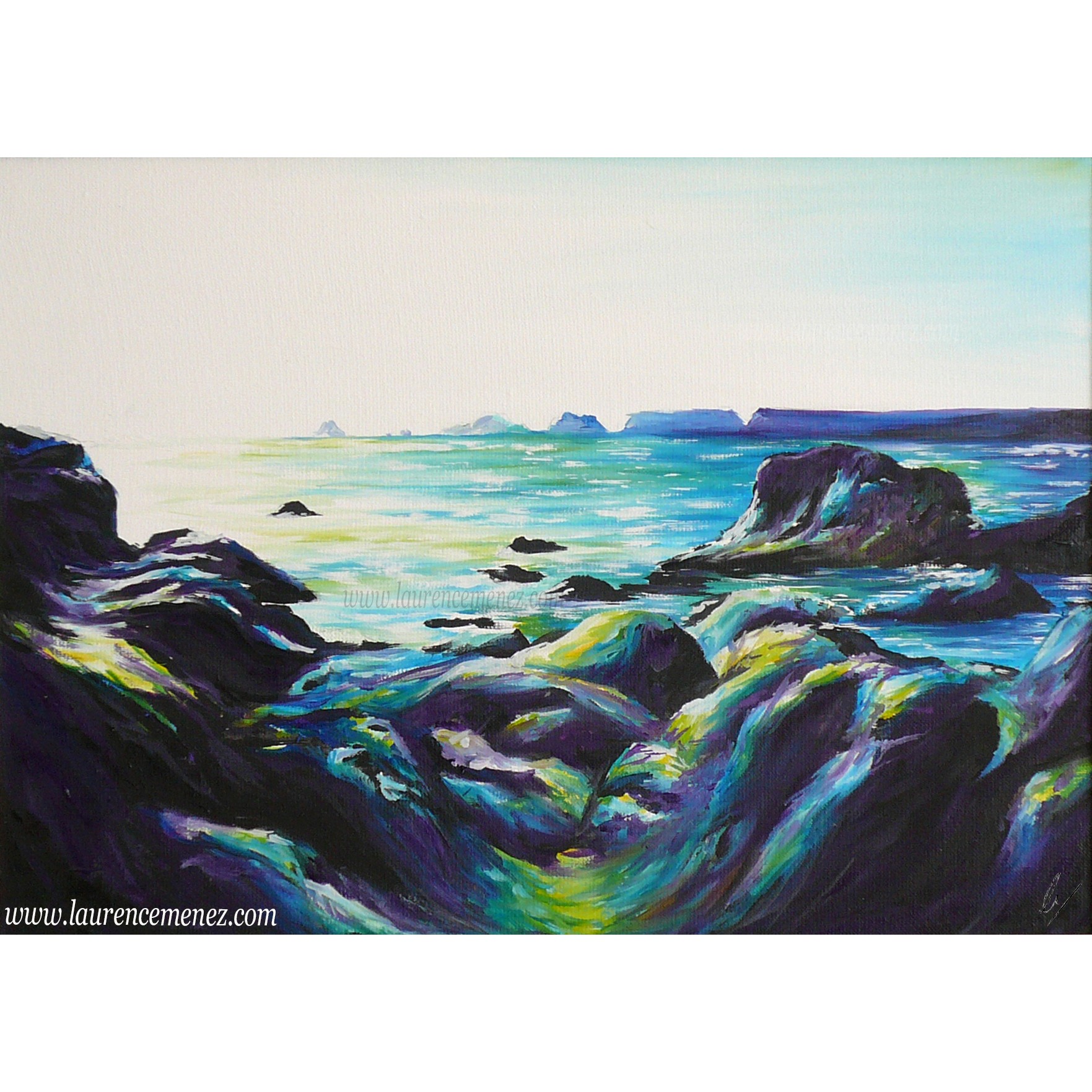 Tableau en peinture à l'huile représentant les rochers de la pointe de Dinan (Crozon) et en fond les tas de pois.
