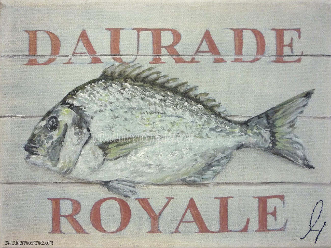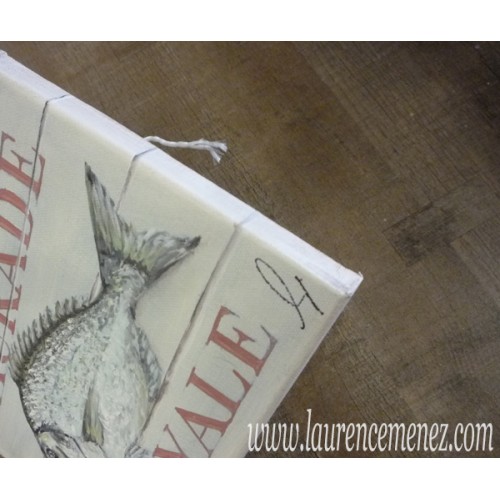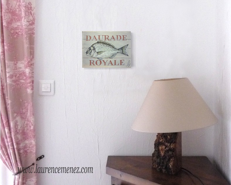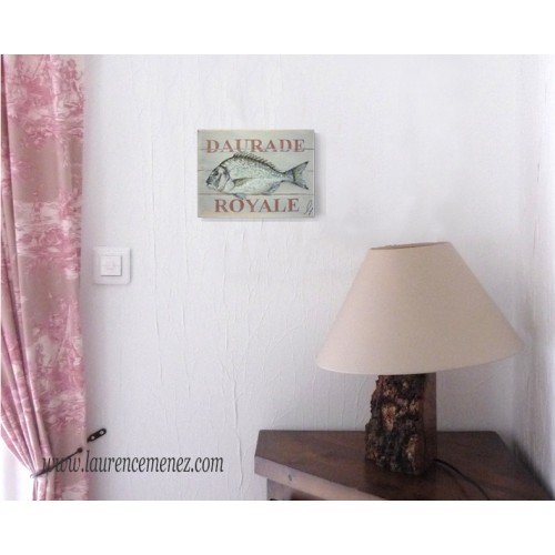 Tableau en peinture à l'huile représentant une Daurade Royale sur un fond imitation bois rosé avec inscription "Daurade Royale".