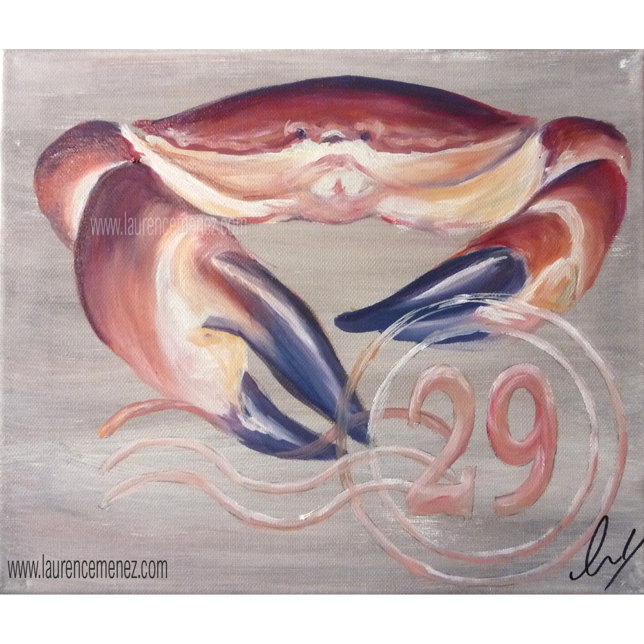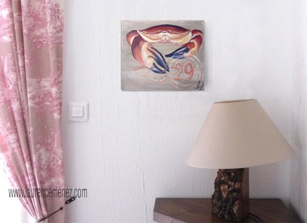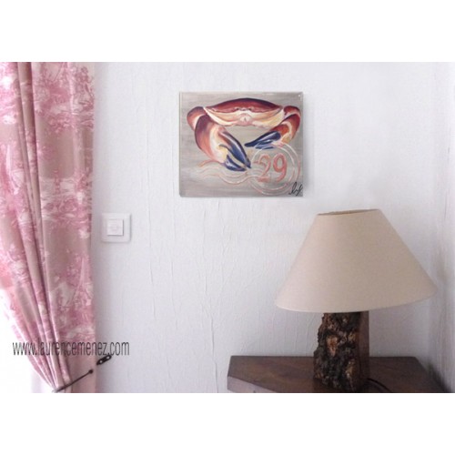Tableau en peinture à l'huile représentant un Tourteau sur un fond imitation bois rosé avec inscription "29".
