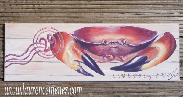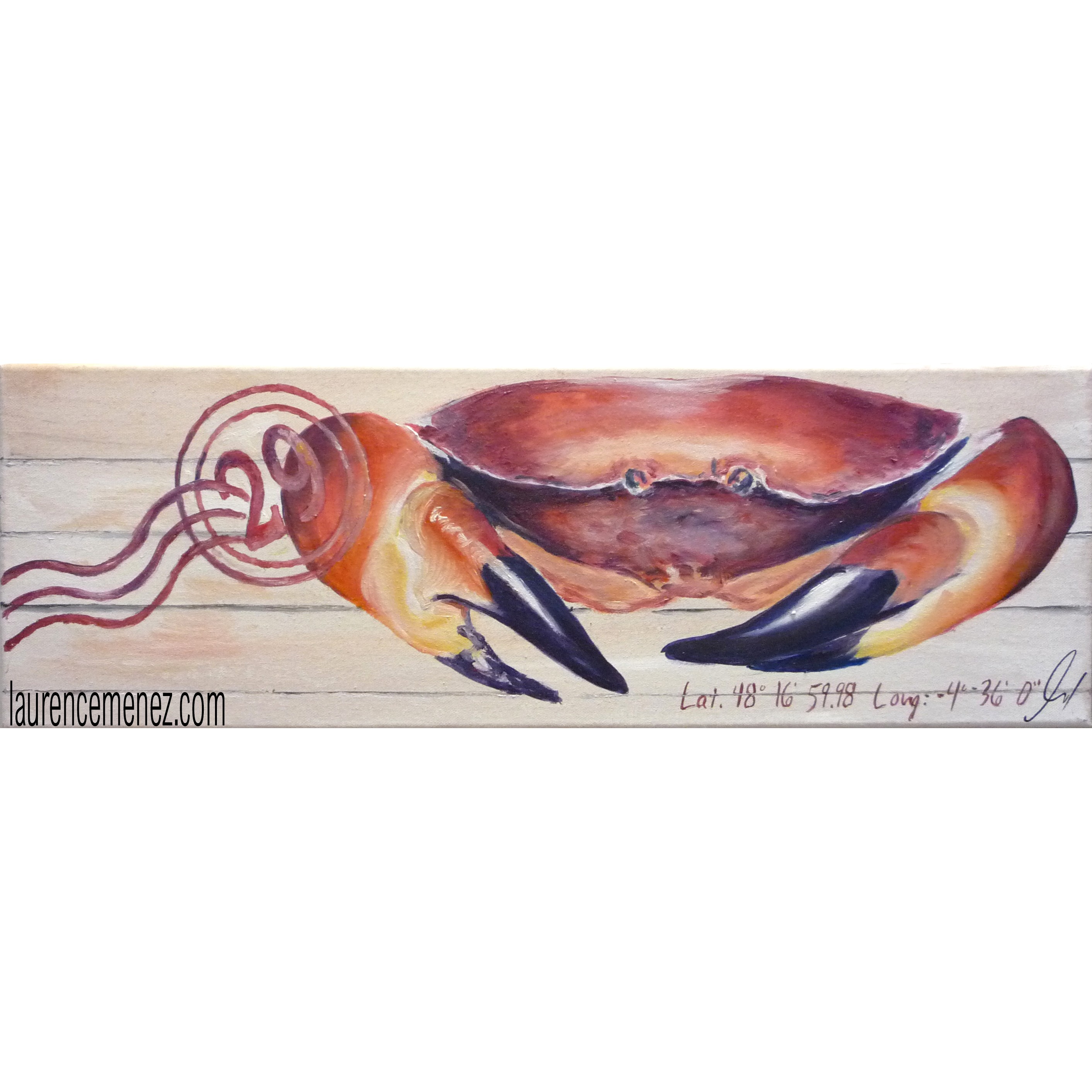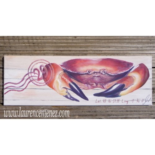Tableau en peinture à l'huile représentant un Tourteau sur un fond imitation bois rosé avec inscription "29".