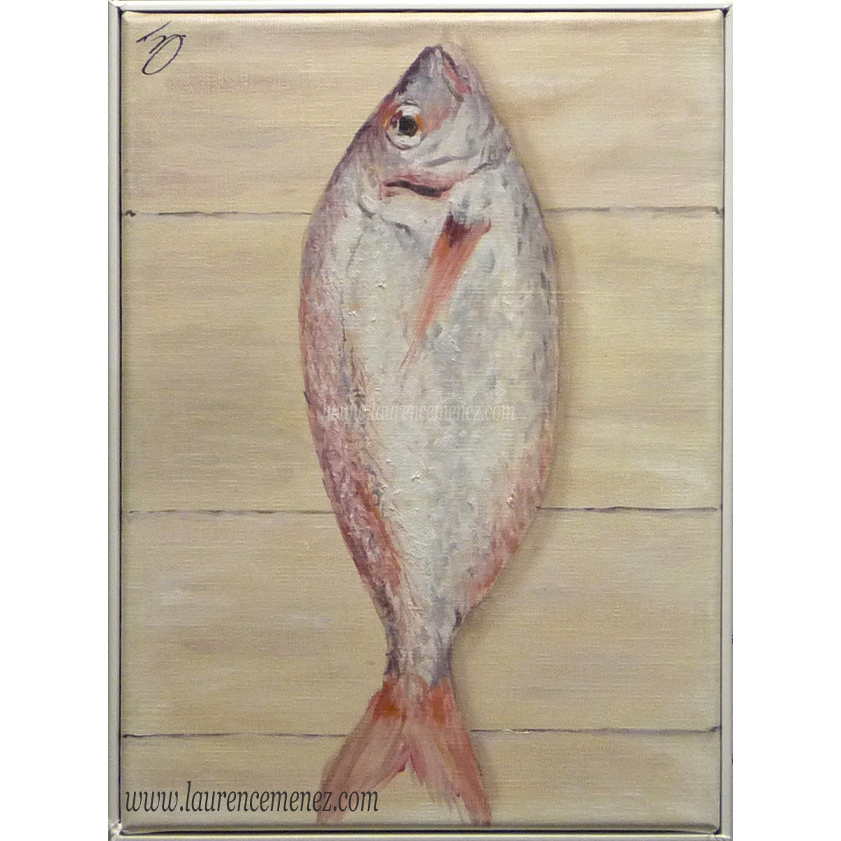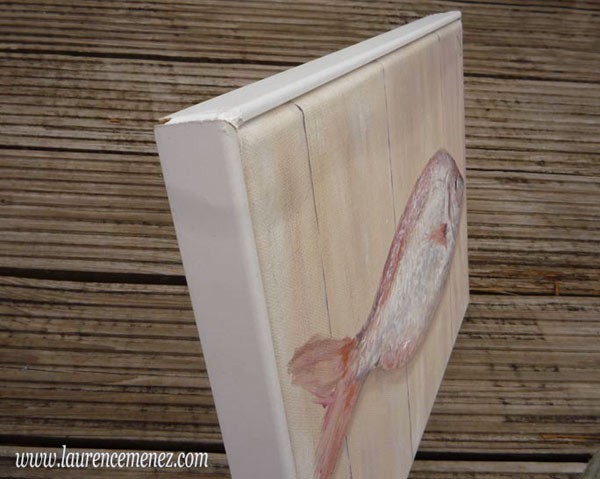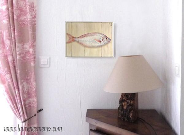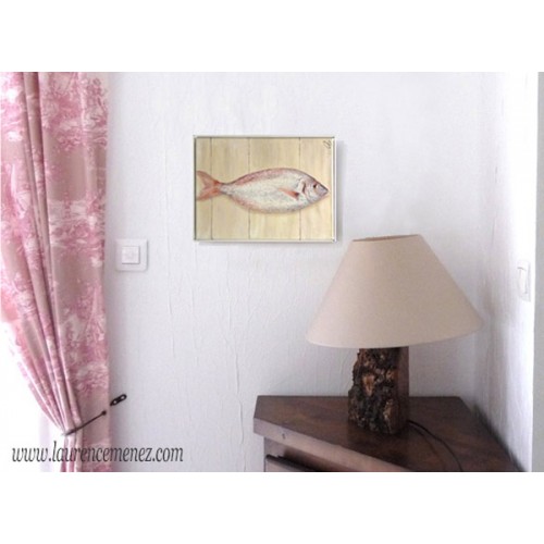 Tableau en peinture à l'huile représentant une dorade rose sur un fond imitation bois tons rosés.