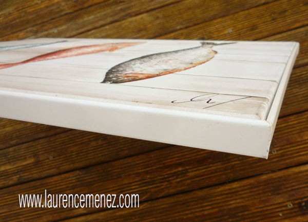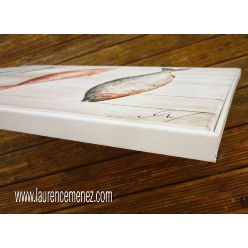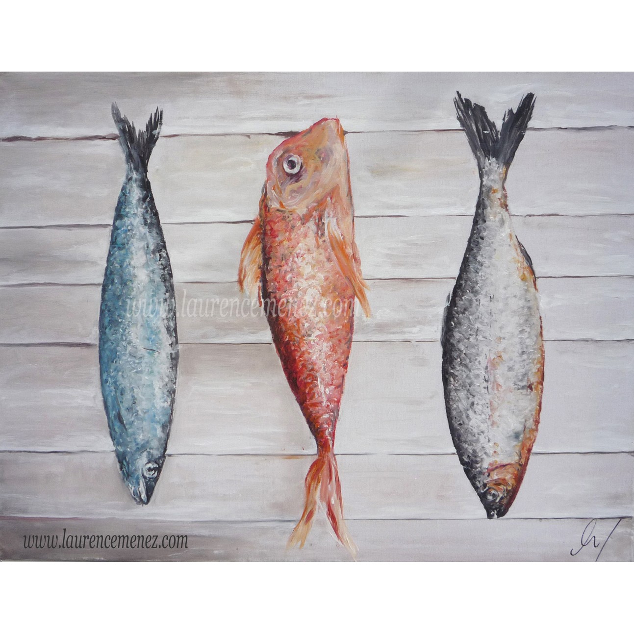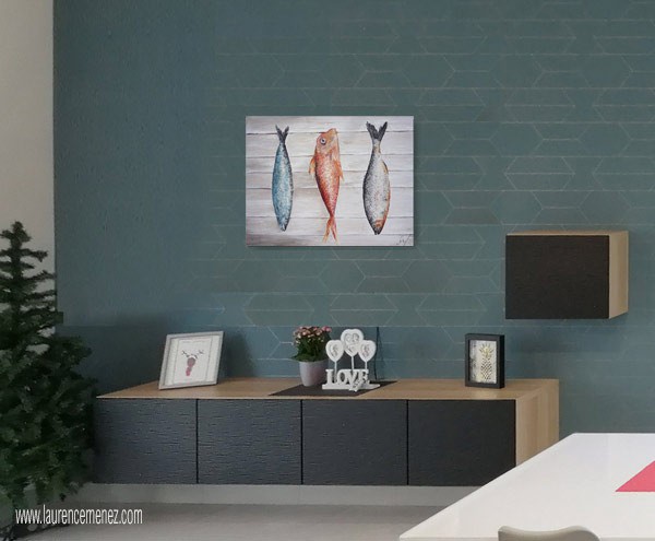 Tableau en peinture à l'huile représentant 3 poissons sur un fond imitation bois rose-grisé.