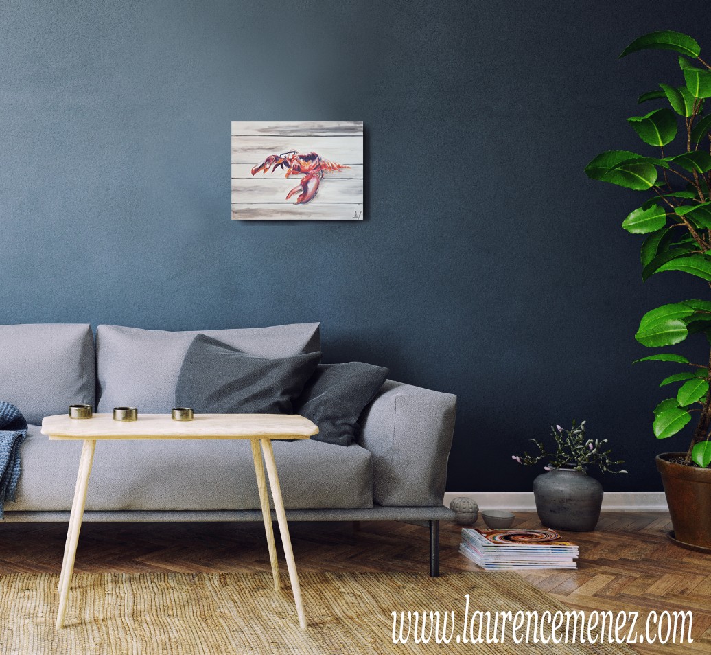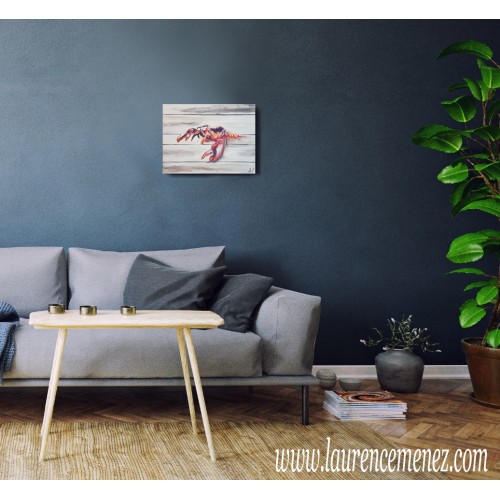 Tableau en peinture à l'huile représentant un Homard dans les tons oranges et violets sur un fond imitation bois blanc.
