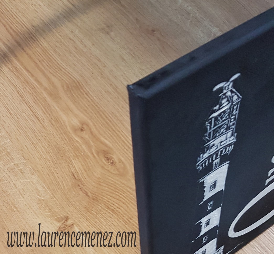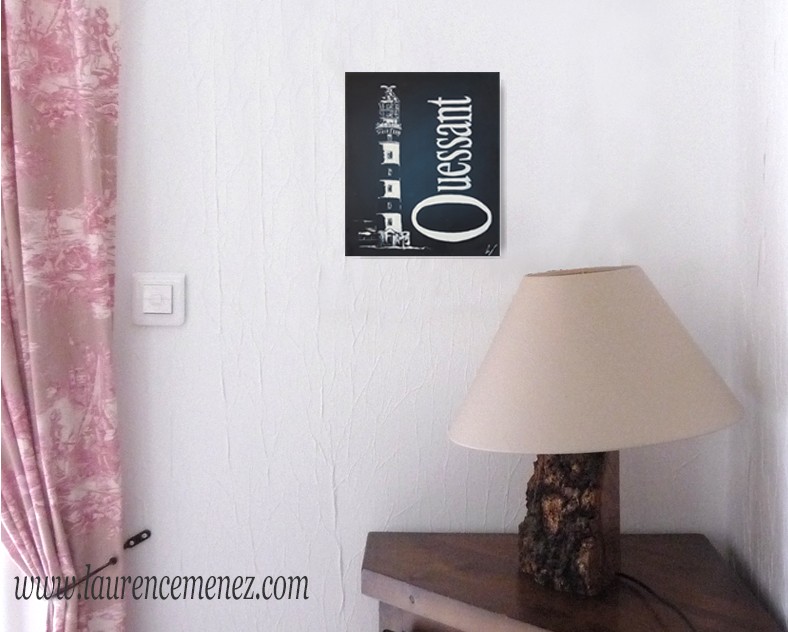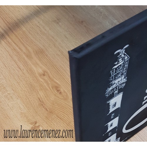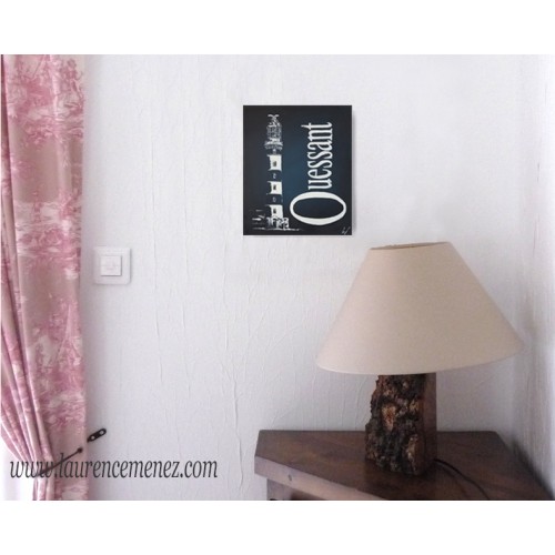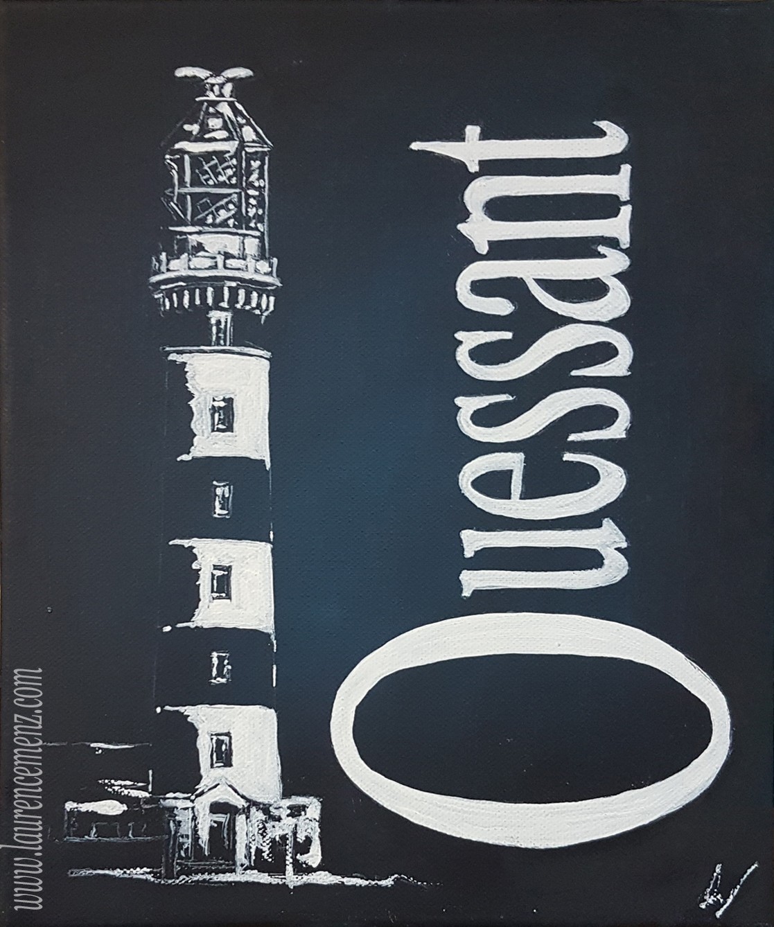 Tableau en peinture à l'huile représentant le Phare du Créac'h en blanc sur fond bleu nuit, inscription "Ouessant" blanche.