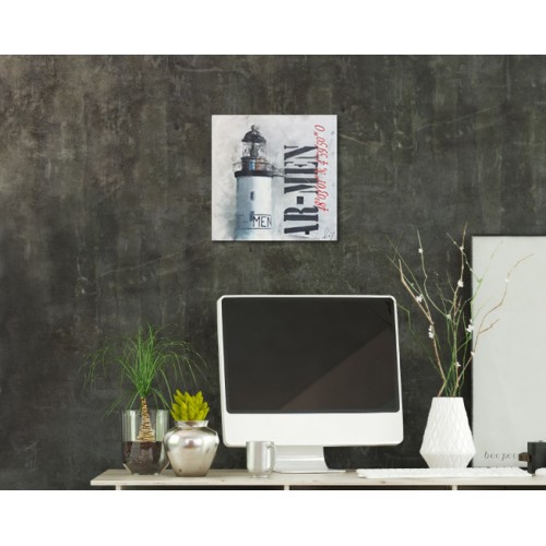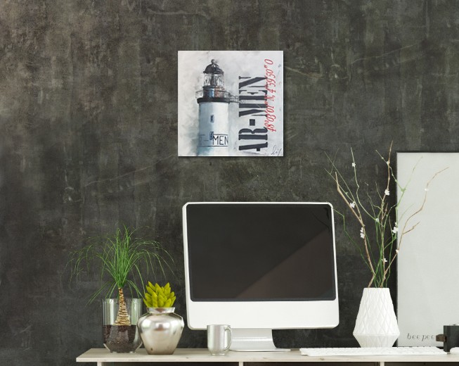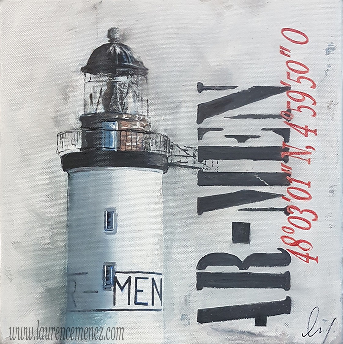 Tableau peinture à l'huile représentant le Phare d'Ar-Men sur fond Blanc avec texte noir, et position GPS du phare en orange.