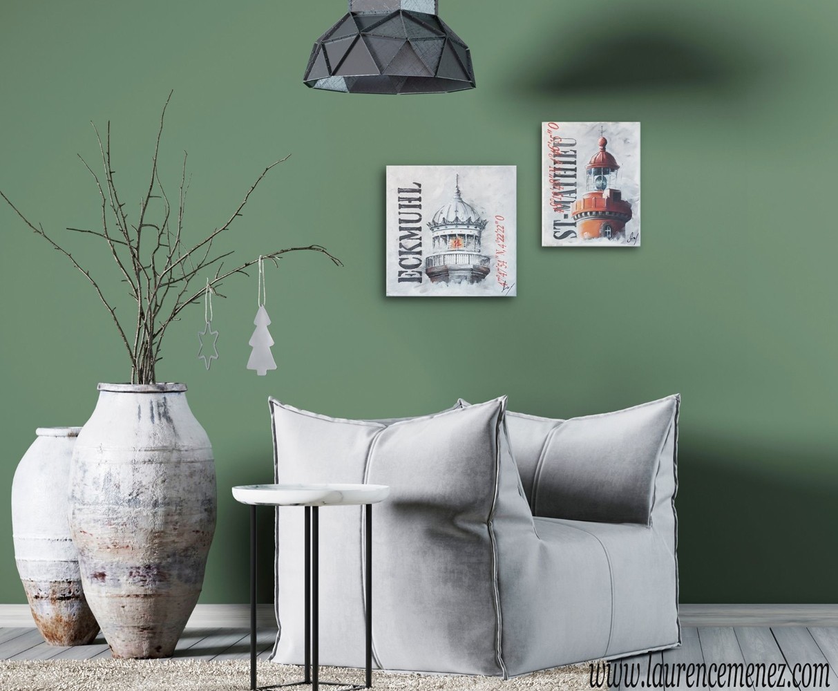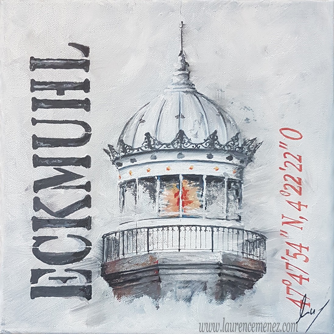 Tableau peinture à l'huile représentant le Phare d'Eckmühl sur fond blanc avec texte noir, et position GPS du phare en orange.