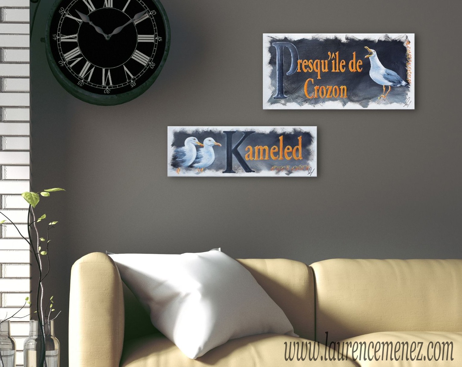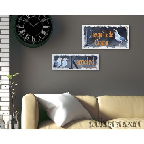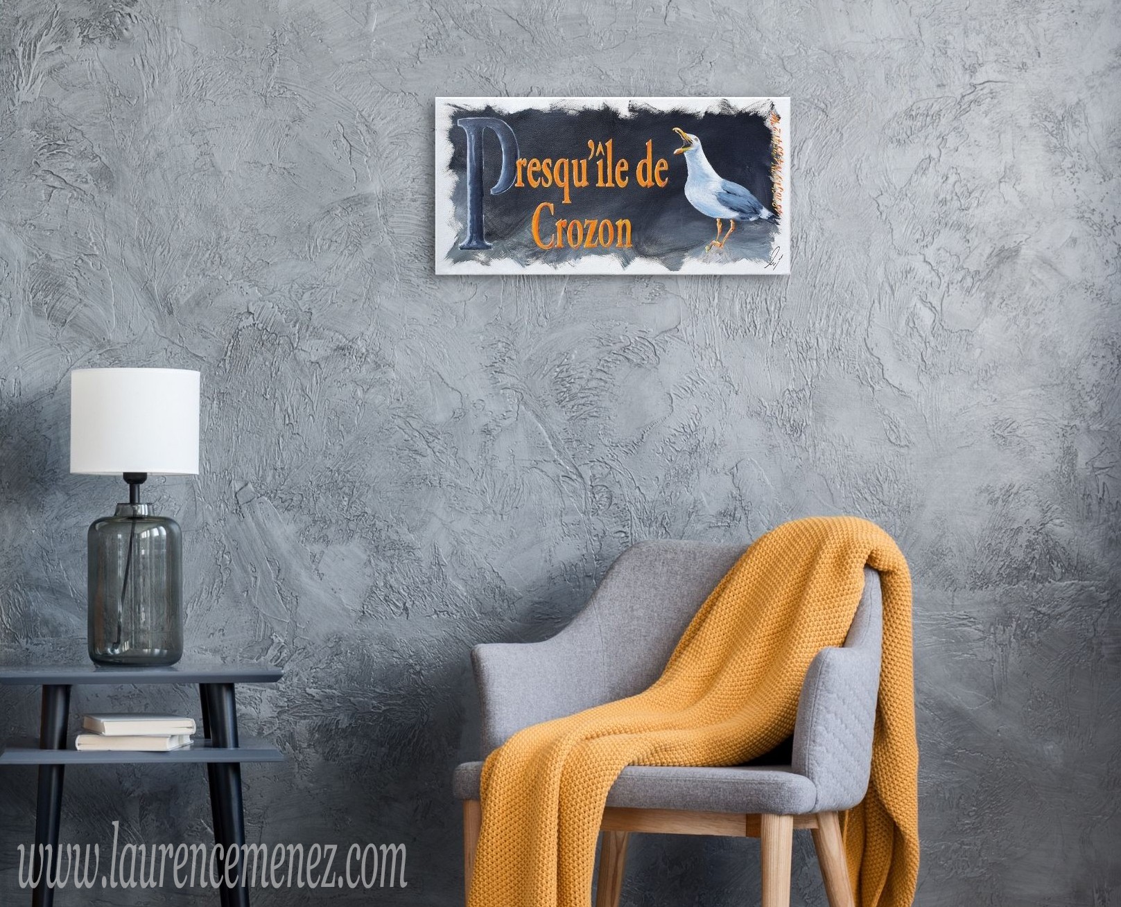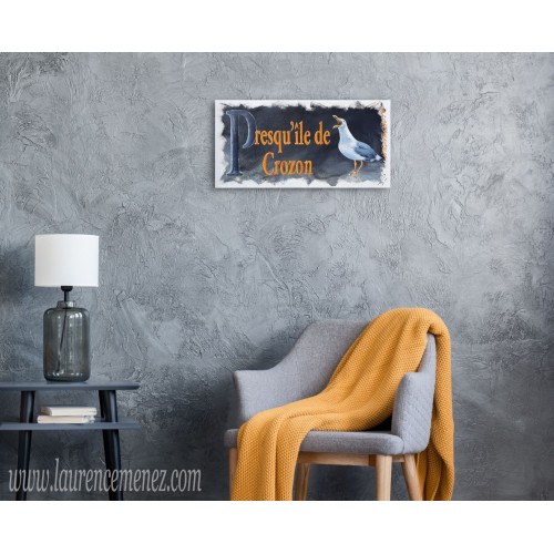 Tableau en peinture à l'huile représentant 1 goéland sur fond gris dégradé avec inscription "Presqu'île de Crozon" et position gps.