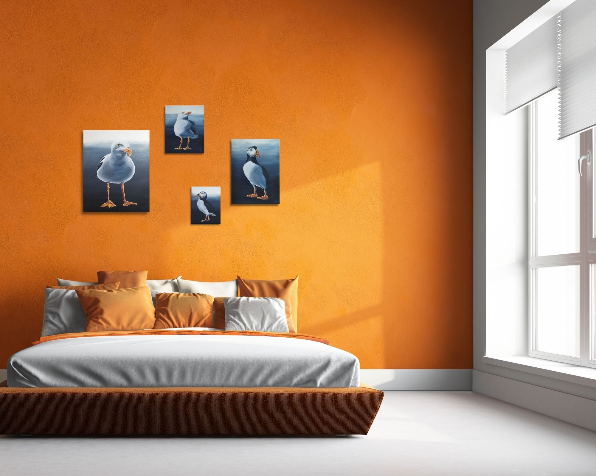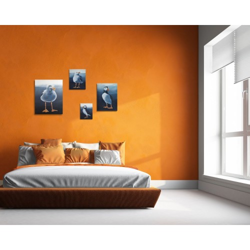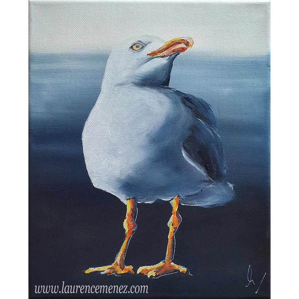 Tableau en peinture à l'huile représentant 1 goéland sur fond gris dégradé .