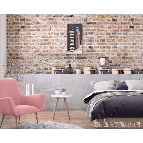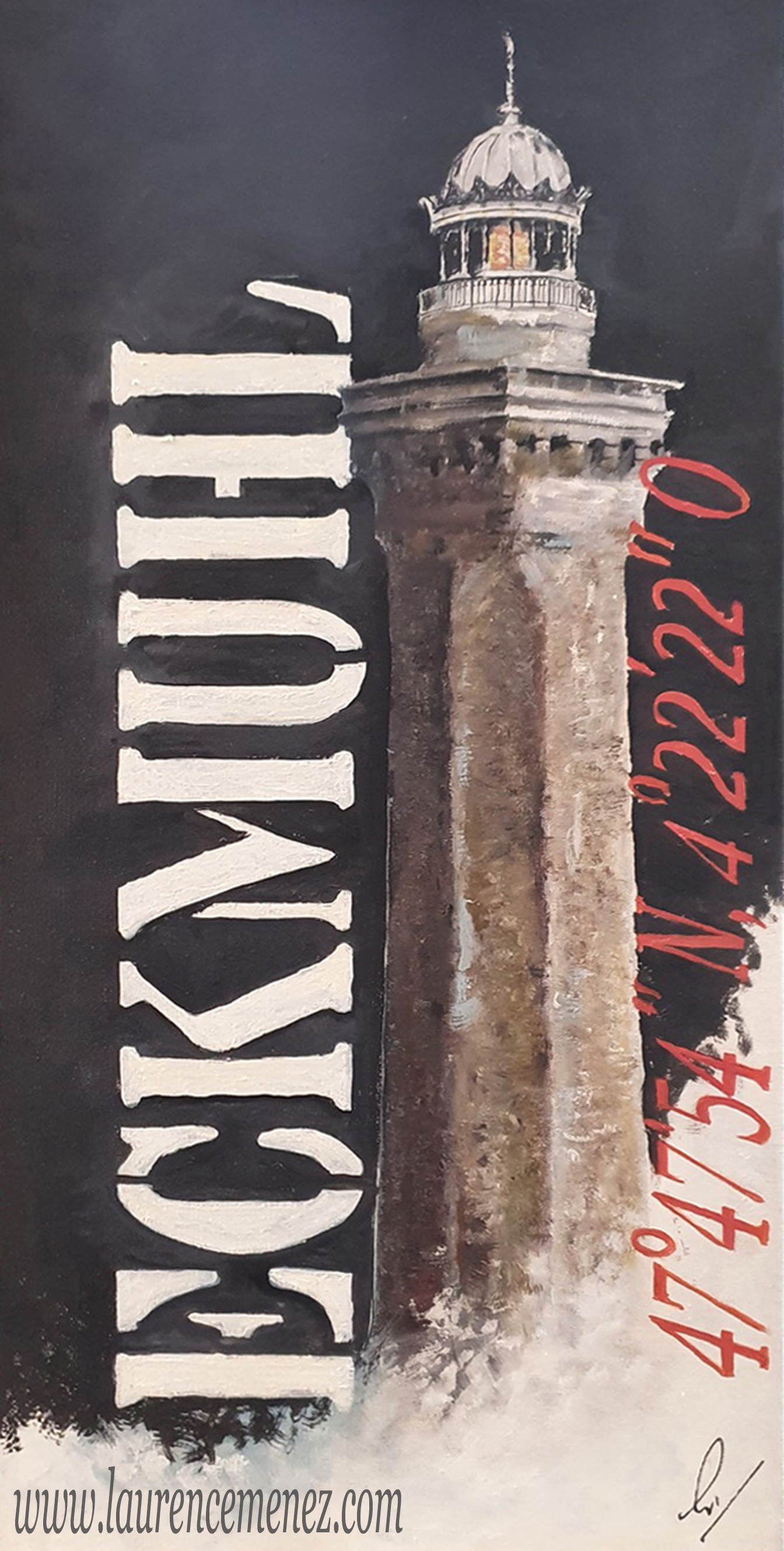Tableau peinture à l'huile représentant le Phare d'Eckmühl sur fond noir avec texte blanc, et position GPS du phare en rouge.